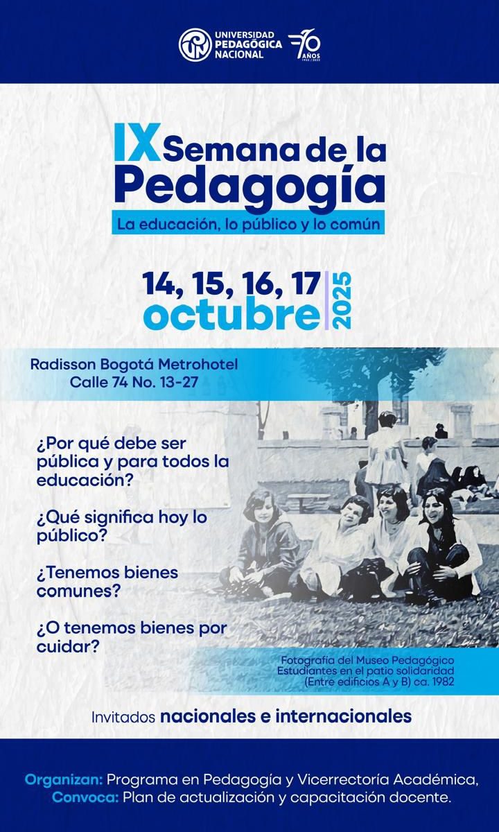Nos complace extenderles una cordial invitación a la IX Semana de la Pedagogía: La educación, lo público y lo común, que se celebrará del 14 al 17 de octubre de 2025 en el Radisson Bogotá Metrohotel (Calle 74 No. 13-27).