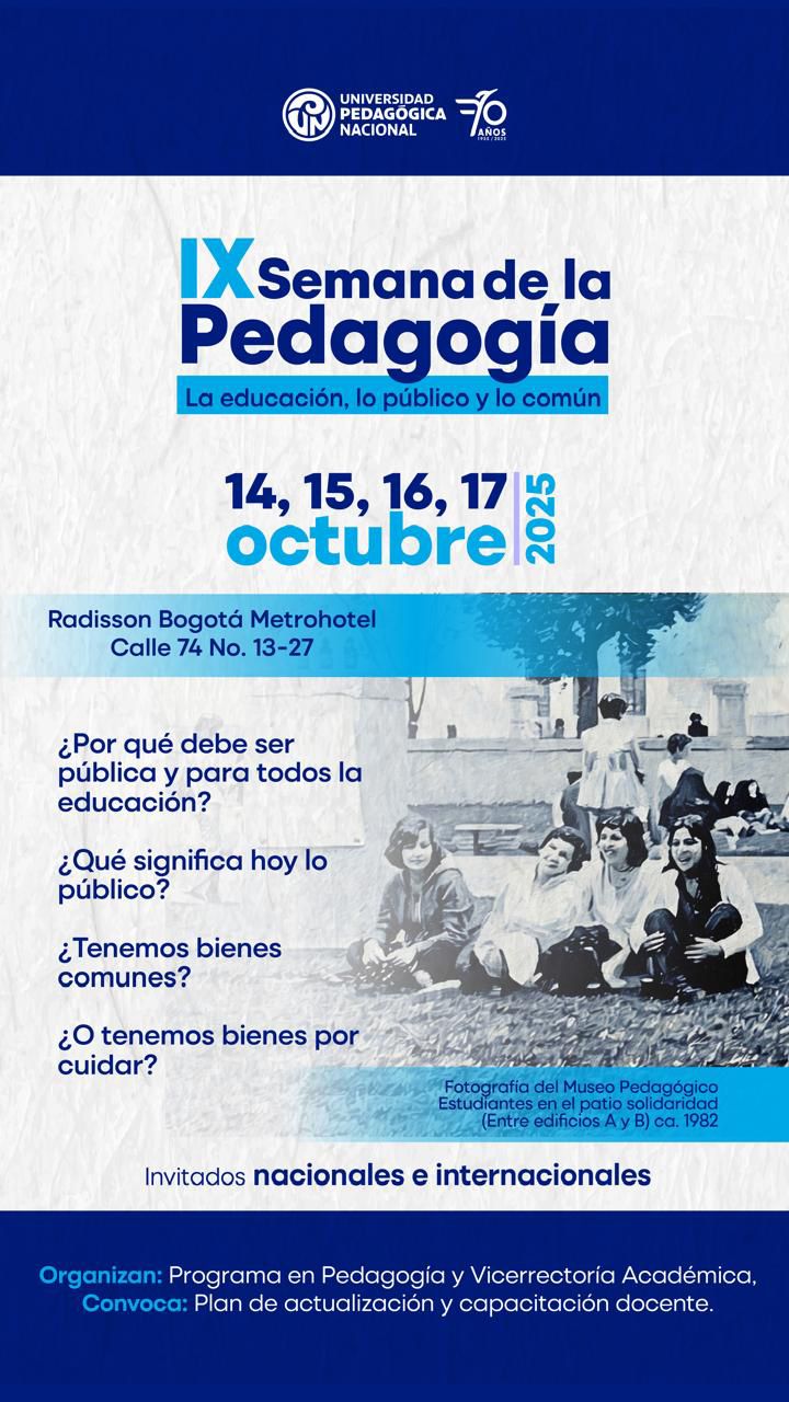 Estimada comunidad académica:Nos complace extenderles una cordial invitación a la IX Semana de la Pedagogía: La educación, lo público y lo común, que se celebrará del 14 al 17 de octubre de 2025 en el Radisson Bogotá Metrohotel (Calle 74 No. 13-27). Este evento, organizado por el Programa en Pedagogía y la Vicerrectoría Académica, y … Sigue leyendo IX Semana de la Pedagogía: La educación, lo público y lo común.