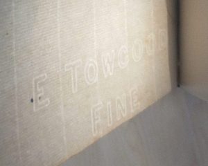 Con respecto a su materialidad, el cuaderno cuenta con papel de escritura fabricado para el uso de plumas de tinta. Llama la atención que, al ubicar una fuente de luz directa sobre sus hojas, se identifica la marca de agua ‘E. Towgood Fine’. Esta inscripción pertenecía a ‘Edward Towgood & Sons Ltd.’, una empresa industrial de Sawston que se consolidó como una de las principales productoras británicas de papel de alta calidad durante el siglo XIX y parte del siglo XX.